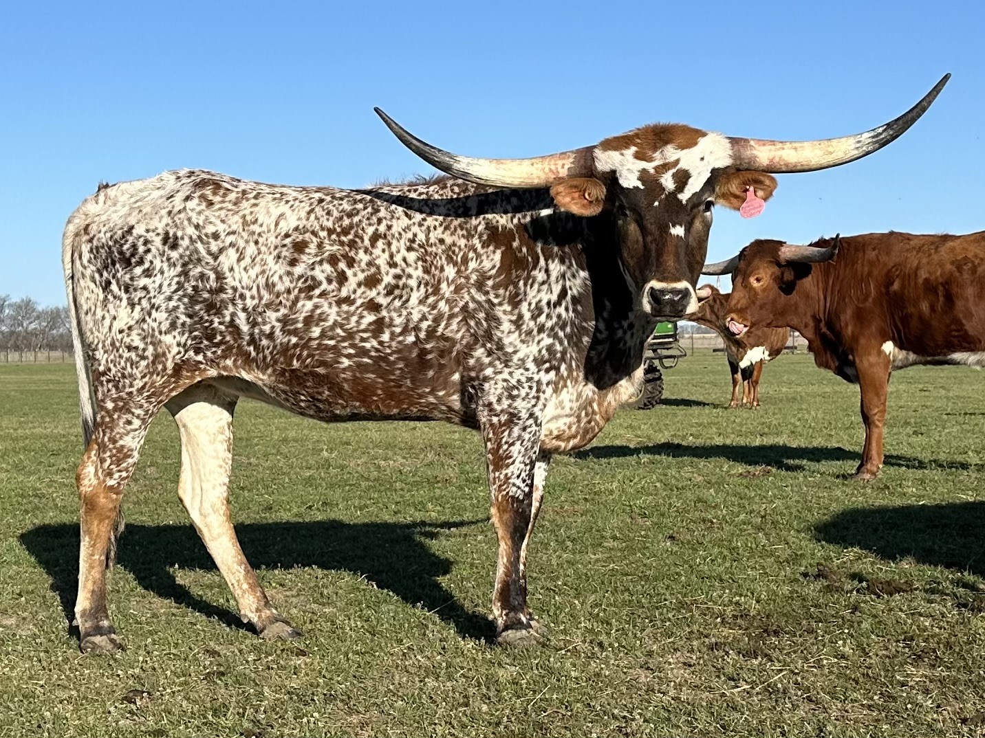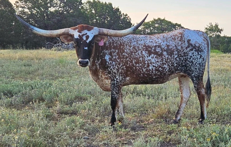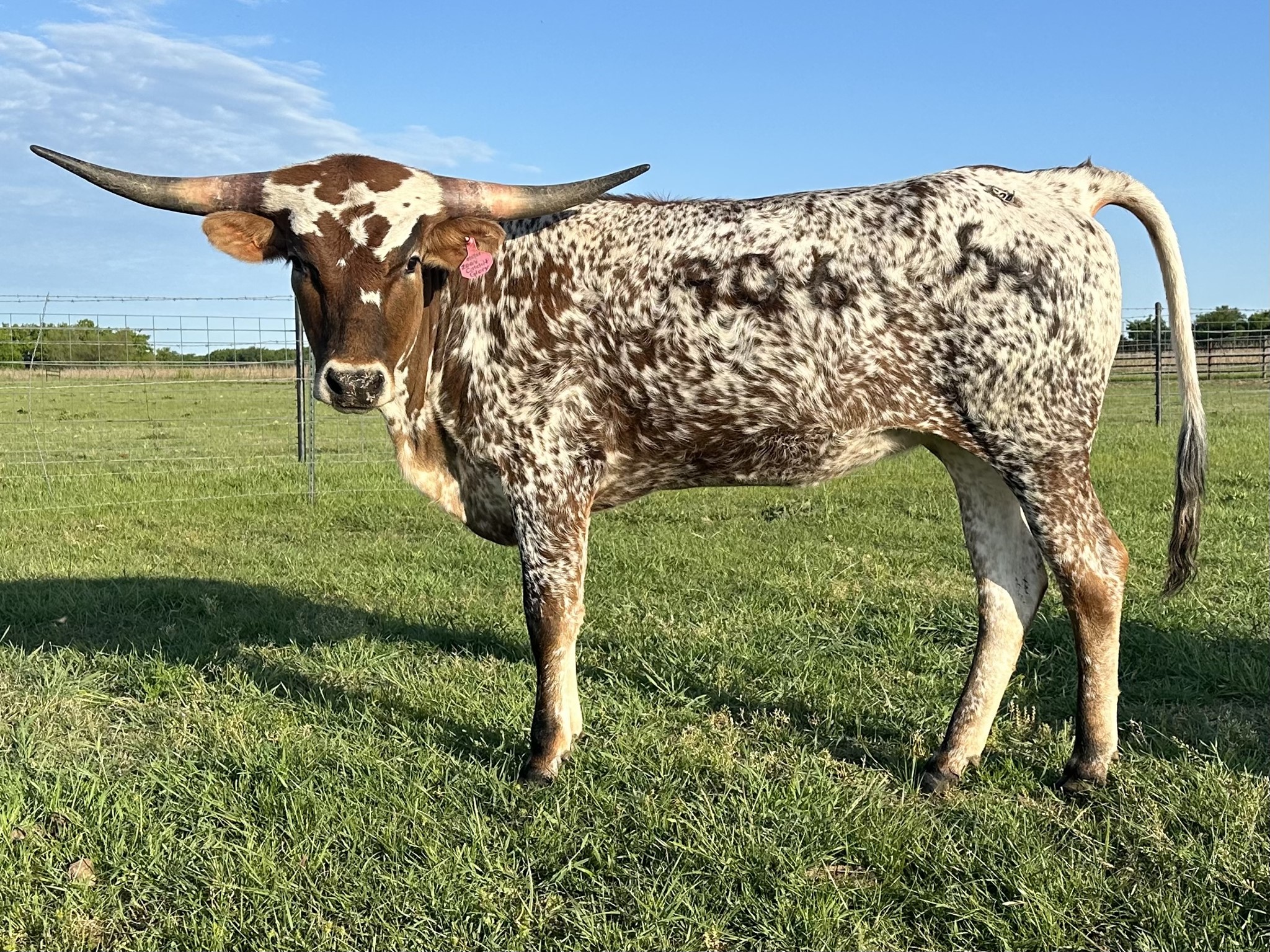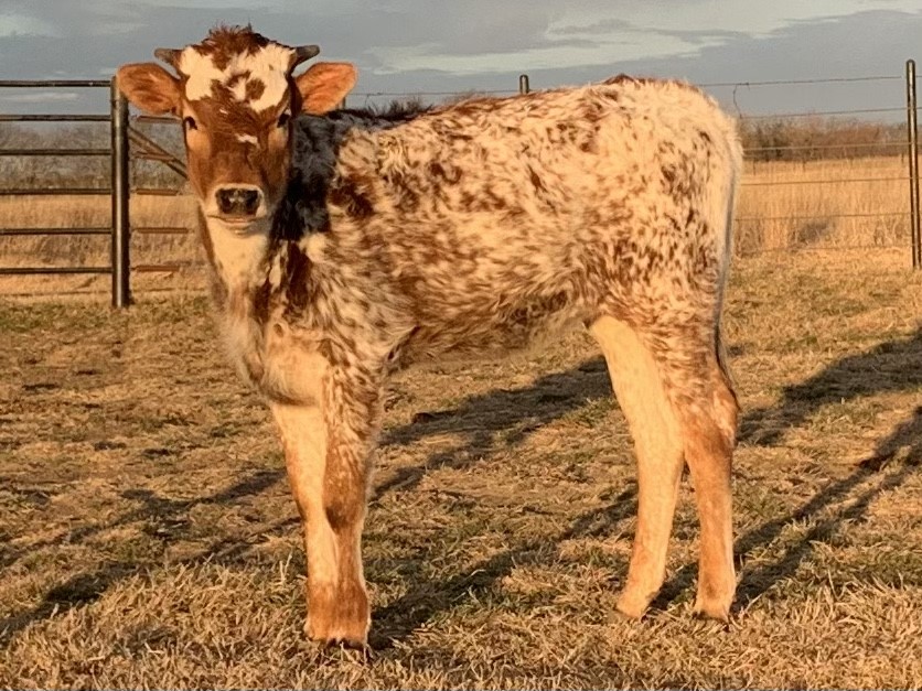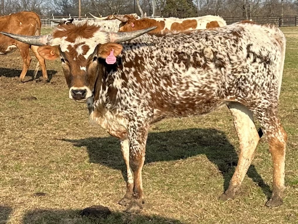 FHR 20G's Catchit Glory is a colorful young cow with a speckled coat and great horn direction. Her pedigree is stacked with 20 Gauge, Concealed Weapon, Catchit Chex, and JP Rio Grande. She has a gentle demeanor and loves her evening head scratches.
