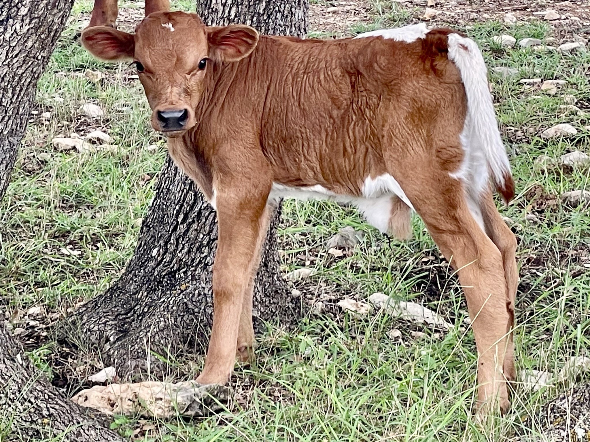 Dark red with white speck on forehead, black nose, small white topline, white underline, white tail with dark red switch.