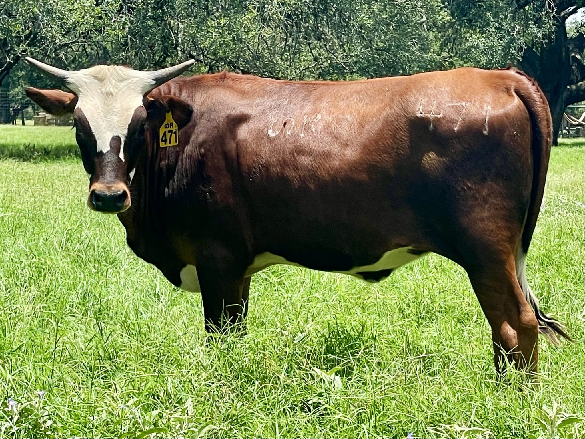 Parker Brown with white shield and white patches on cheeks, white on belly, white on feet, white ring on tail, dark switch