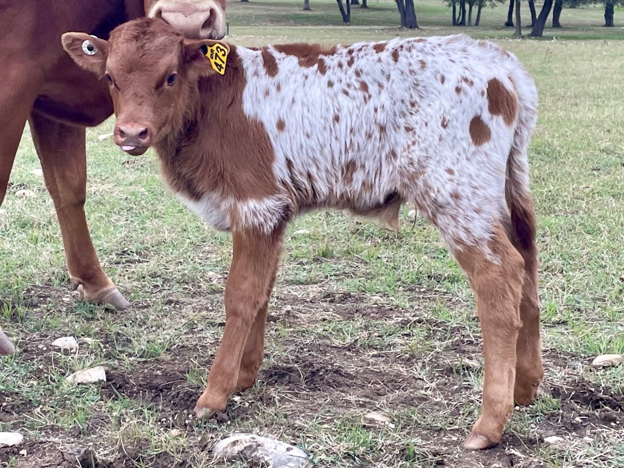 Red head, neck, shoulders, and legs. White body with red speckles and large red patches. Dark tail tip.