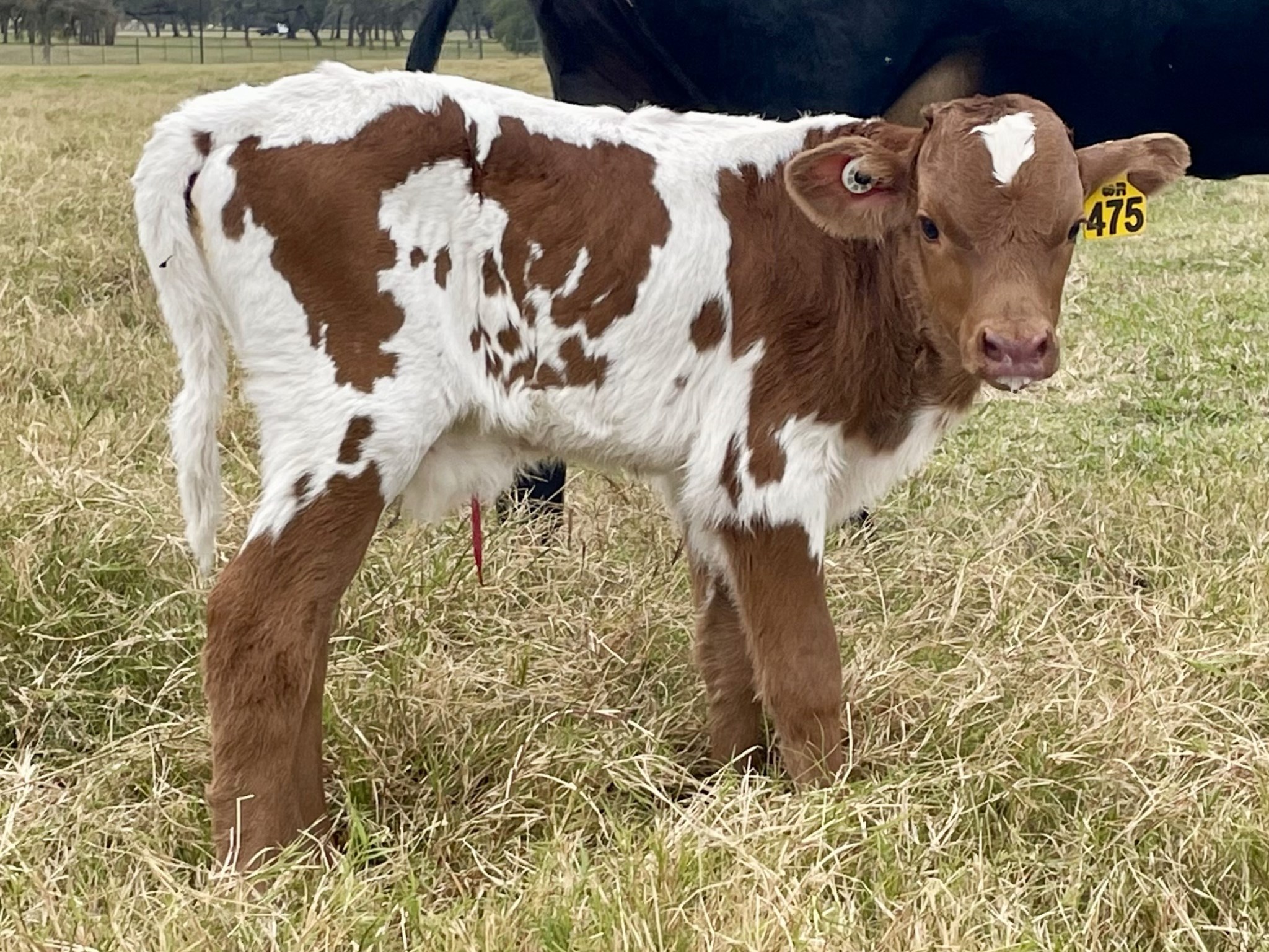 Red head with white star, red neck and shoulders, white body with large red patches.