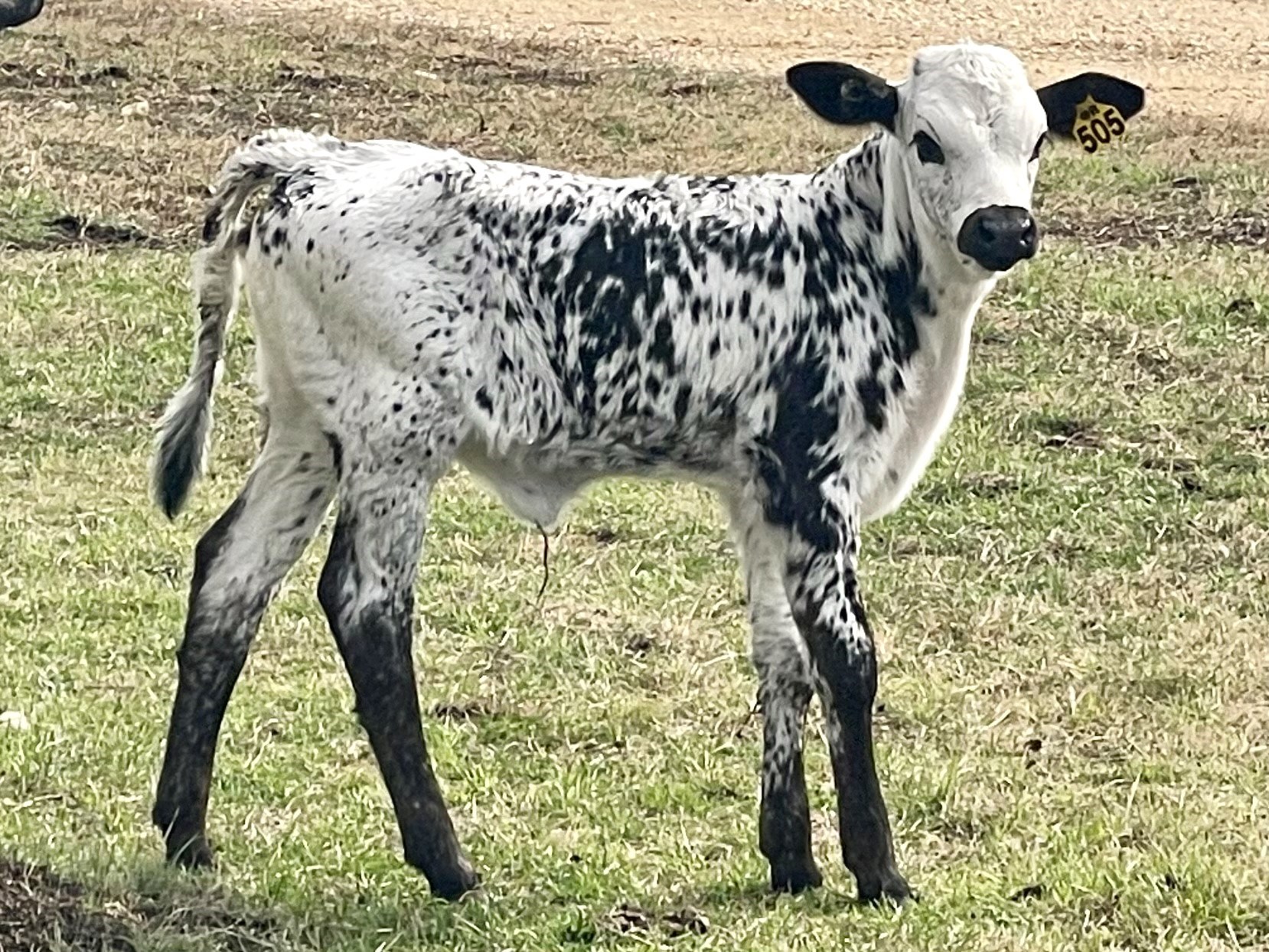 White body with black ears and mouth ring, blue roan, and black specks.