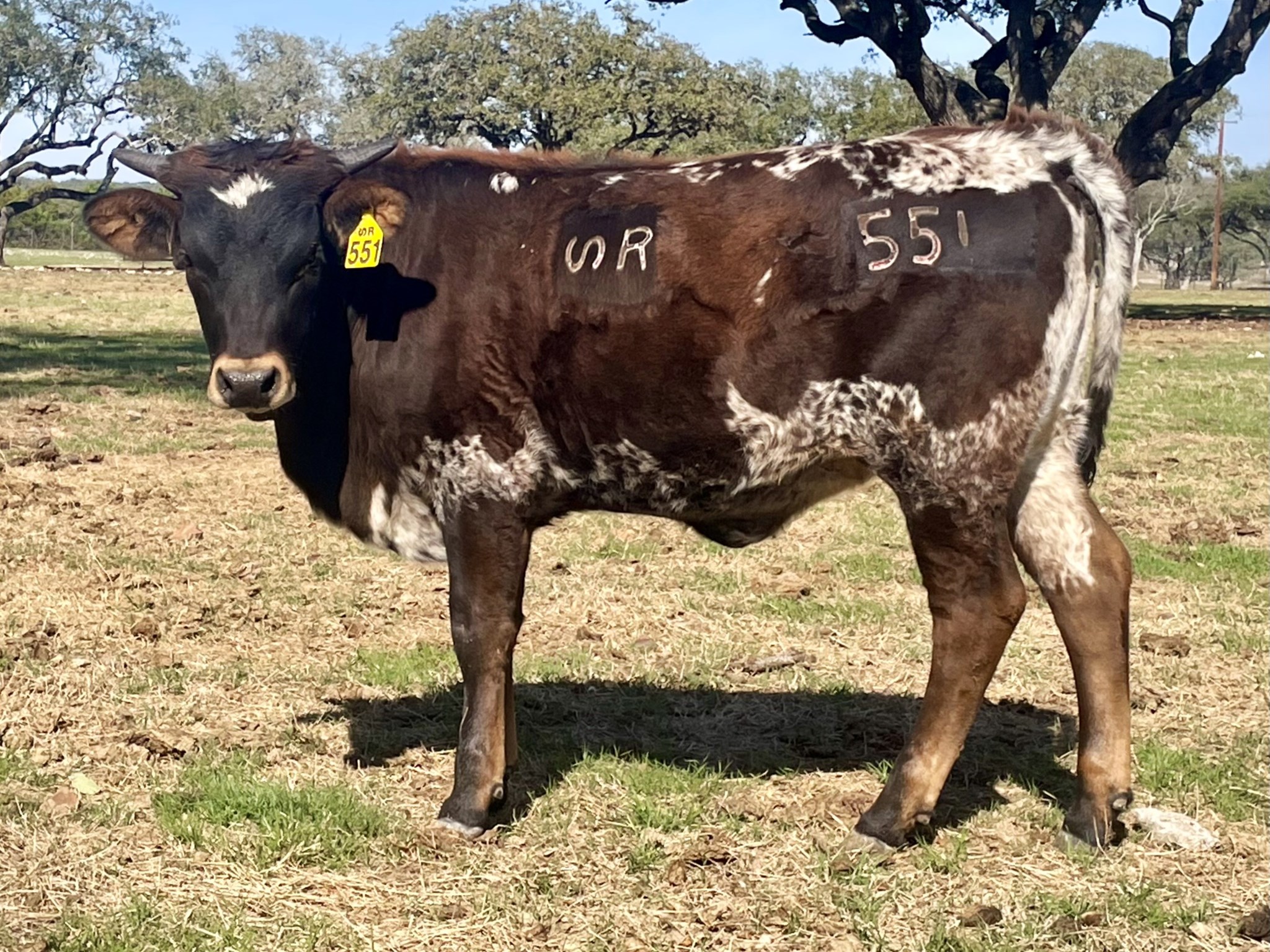 Parker brown with white star and black nose, speckled white underline, speckled white along top of hips and tail.