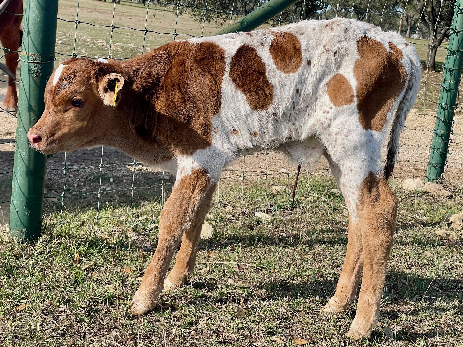 Red head with white star, red neck, shoulders, and legs. White body with red patches and red speckles.