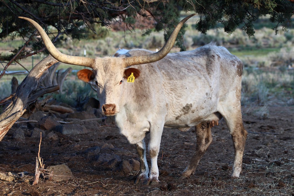 Thank you Bentwood Ranch for the chance to own this important cow! According to Dr. Dameron, she has produced at least 3 offspring over 70" so far. One is close to 80". We will be using Star in our ET program and hope to have embryos available. We have had two very successful flushes and can now let this famous cow go to another program. She is very fertile and should continue to produce well. She is nervous in the chute but is not difficult to handle in the herd. Consigned to the Fey Longhorns Ranch Sale and Social, June 8, Yamhill, OR