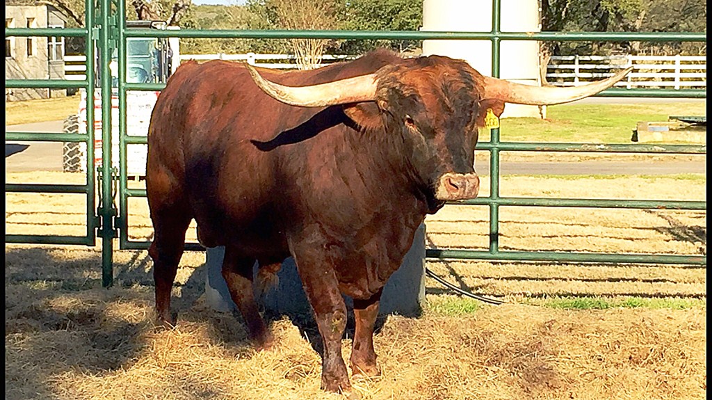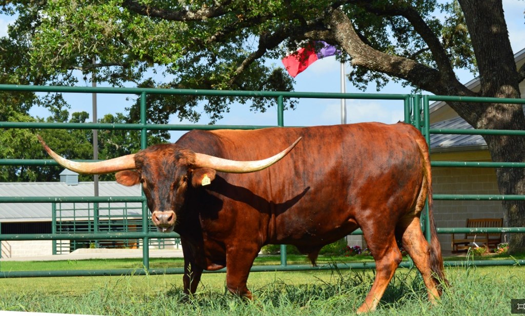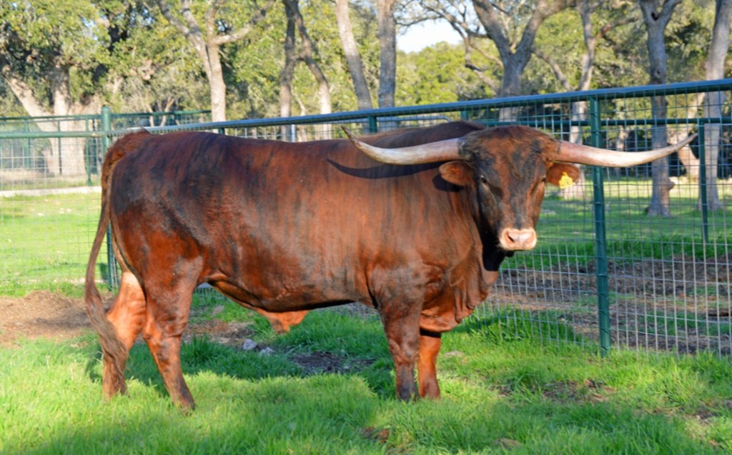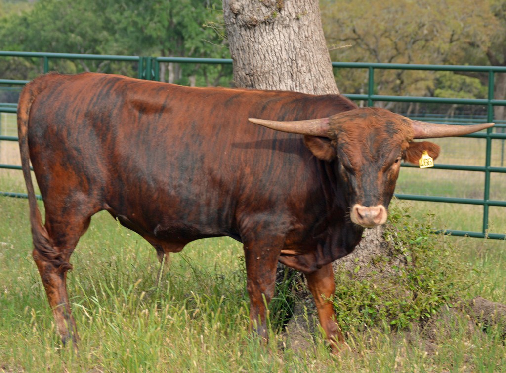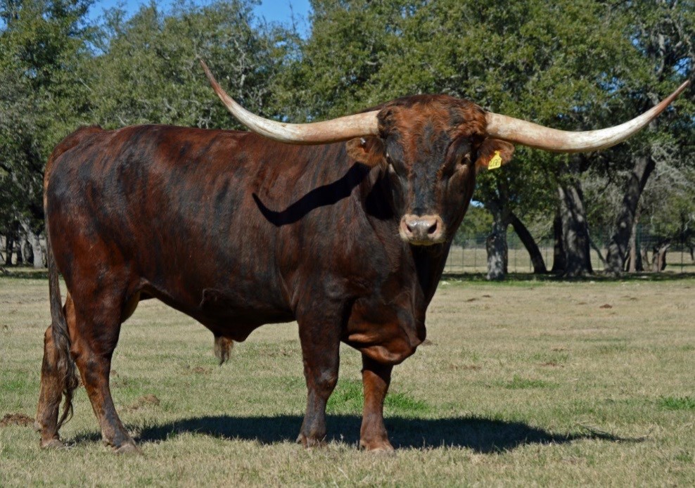 SR Clout 466 is the 2019 TLBAA Junior Get of Sire Award winner! At the TLBAA Horn Showcase 2016 in Lawton, OK, Clout placed 1st in TTT, 1st in Composite Class 47, and was a Superior Award winner. Clout is a large-bodied, brindle, registered Texas Longhorn bull. Clout adds straight toplines, correct conformation, and vibrant color to any breeding program. His offspring are all big, boldly-colored, and beautifully built. He breeds the ideal Longhorn!