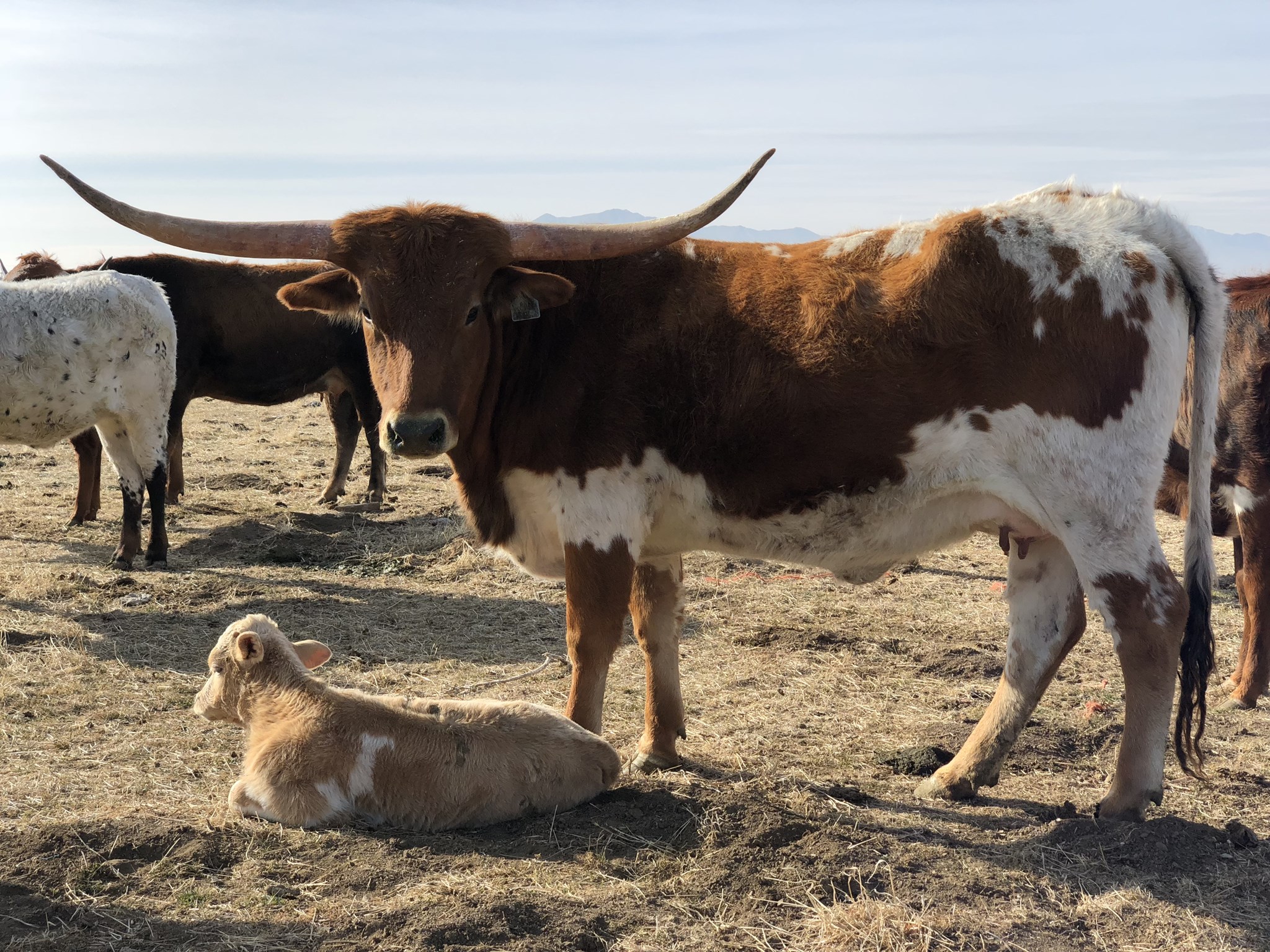 Annie Oakley is a beautiful young heifer we bought from Darol Dickinson. She has two over 90 inch cows in her pedigree (Shadow Jubilee and Jester), and 4 over 80 inch bulls in her pedigree (Temptations the Ace, Tempter, Jamakizm & Drag Iron). For good measure, we can also throw in amazing producers like Winchester, Field of Pearls and Win Jubilee for safety. This pedigree is jam packed with HUGE horned cattle, lots of twist and big bodied animals all over. Darol predicts she’ll weigh over 1,300 pounds and have close to 80 inches of horn at maturity. Annie Oakley gave birth to a beautiful cream colored Gold Mine heifer on November 9, 2017.